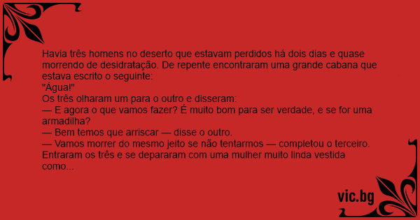 Havia três homens no deserto que estavam perdidos há dois dias e quase morrendo de desidratação. De repente encontraram uma grande cabana que estava escrito o seguinte: