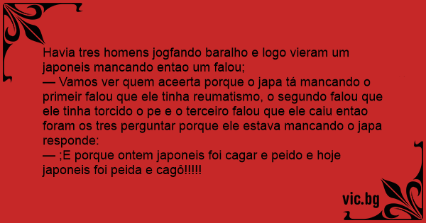 Havia tres homens jogfando baralho e logo vieram um japoneis mancando entao um falou;