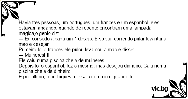 Havia tres pessoas, um portugues, um frances e um espanhol, eles estavam andando, quando de repente encontram uma lampada magica,o genio diz: