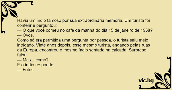 Havia um índio famoso por sua extraordinária memória. Um turista foi conferir e perguntou: