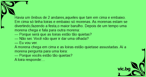 Um grupo de vinte mulheres foram fazer uma viagem, 10 morenas e 10 loiras,o ônibus era leito (de dois andares). Assim decidiram que as morenas em baixo e as loiras em cima. Ai as morenas só fazendo...