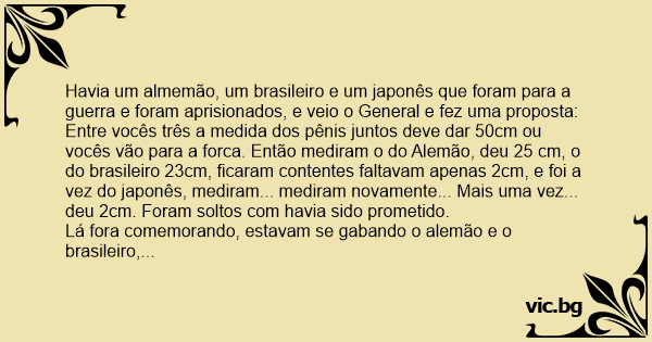 Havia um almemão, um brasileiro e um japonês que foram para a guerra e foram aprisionados, e veio o General e fez uma proposta: Entre vocês três a medida dos pênis juntos deve dar 50cm ou vocês vão para a forca. Então mediram o do Alemão, deu 25 cm, o do brasileiro 23cm, ficaram contentes faltavam apenas 2cm, e foi a vez do japonês, mediram... mediram novamente... Mais uma vez... deu 2cm. Foram soltos com havia sido prometido.