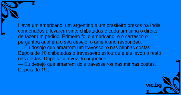 Havia um americano, um argentino e um brasileiro presos na Índia condenados a levarem vinte chibatadas e cada um tinha o direito de fazer um pedido. Primeiro foi o americano, e o carrasco o perguntou qual era o seu desejo, o americano respondeu:
