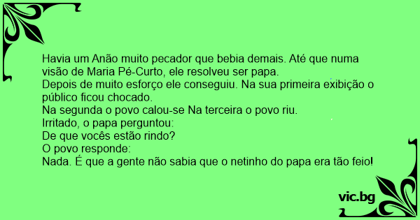 Havia um Anão muito pecador que bebia demais. Até que numa visão de Maria Pé-Curto, ele resolveu ser papa.