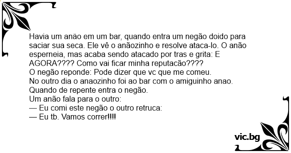 Havia um anäo em um bar, quando entra um negão doido para saciar sua seca. Ele vê o anãozinho e resolve ataca-lo. O anão esperneia, mas acaba sendo atacado por tras e grita: E AGORA???? Como vai ficar minha reputacão????