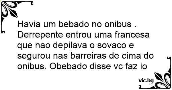 Havia um bebado no onibus . Derrepente entrou uma francesa que nao depilava o sovaco e segurou nas barreiras de cima do onibus. Obebado disse vc faz io