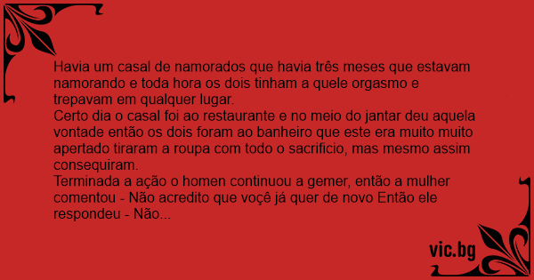 Havia um casal de namorados que havia três meses que estavam namorando e toda hоrа os dois tinham a quele orgasmo e trepavam em qualquer lugar.