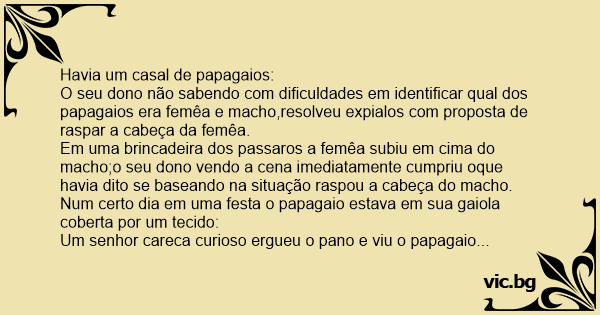 O seu dono não sabendo com dificuldades em identificar qual dos papagaios era femêa e macho,resolveu expialos com proposta de raspar a cabeça da femêa.