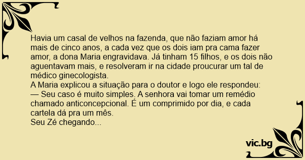 Havia um casal de velhos na fazenda, que não faziam amor há mais de cinco anos, a cada vez que os dois iam pra cama fazer amor, a dona Maria engravidava. Já tinham 15 filhos, e os dois não aguentavam mais, e resolveram ir na cidade proucurar um tal de médico ginecologista.