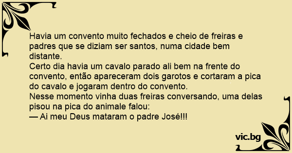 Certo dia havia um cavalo parado ali bem na frente do convento, então apareceram dois garotos e cortaram a рiса do cavalo e jogaram dentro do convento.