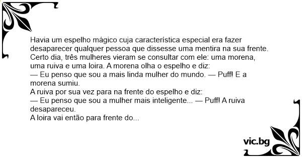 Certo dia, três mulheres vieram se consultar com ele: uma morena, uma ruiva e uma loira. A morena olha o espelho e diz: