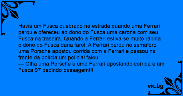 Havia um Fusca quebrado na estrada quando uma Ferrari parou e ofereceu ao dono do Fusca uma carona com seu Fusca na traseira. Quando a Ferrari estiva-se muito rápida o dono do Fusca daria farol. A Ferrari parou no semáfaro uma Porsche apostou corrida com a Ferrari e passou na frente da polícia um policial falou: