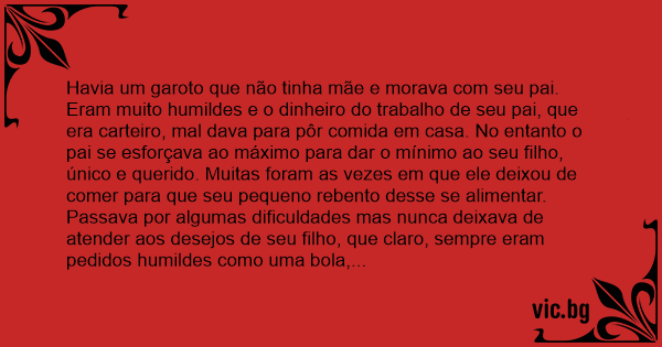 Havia um garoto que não tinha mãe e morava com seu pai. Eram muito humildes e o dinheiro do trabalho de seu pai, que era carteiro, mal dava para pôr comida em casa. No entanto o pai se esforçava ao máximo para dar o mínimo ao seu filho, único e querido. Muitas foram as vezes em que ele deixou de comer para que seu pequeno rebento desse se alimentar.