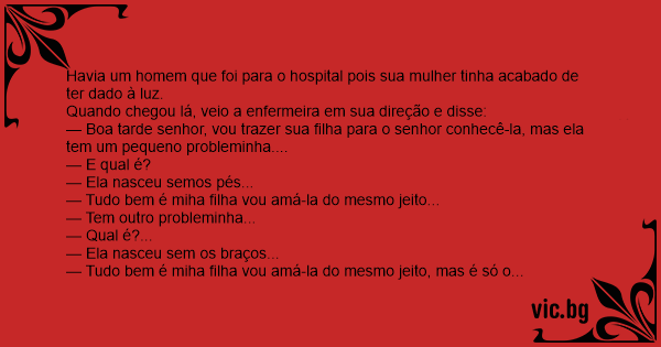 — Boa tarde senhor, vou trazer sua filha para o senhor conhecê-la, mas ela tem um pequeno probleminha....