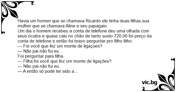 Um dia o homem recebeu a conta de telefone deu uma olhada com seus óculos e quase caiu no chão de tanto susto 720,00 foi preço da conta de telefone e então foi bravo perguntar pro filho filho: