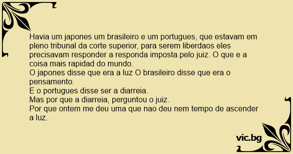 Havia um japones um brasileiro e um portugues, que estavam em pleno tribunal da corte superior, para serem liberdaos eles precisavam responder a responda imposta pelo juiz. O que e a coisa mais rapidad do mundo.