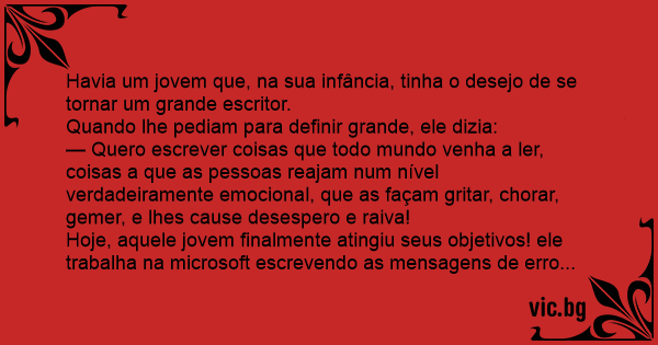 Hoje, aquele jovem finalmente atingiu seus objetivos! ele trabalha na microsoft escrevendo as mensagens de erro...