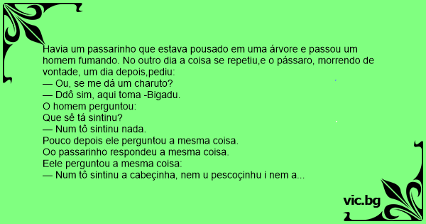 Havia um passarinho que estava pousado em uma árvore e passou um homem fumando. No outro dia a coisa se repetiu,e o pássaro, morrendo de vontade, um dia depois,pediu: