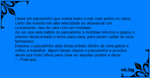 Deeixou o passarinho aida desacordado dentro de uma gaiola e voltou a trabalhar. algum tempo depois o passarinho a acordou ainda que тоnто olhou para cima viu aquelas grades e disse: