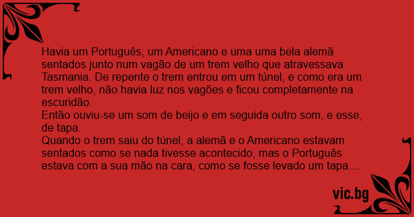 Quando o trem saiu do túnel, a alemã e o Americano estavam sentados como se nada tivesse acontecido, mas o Português estava com a sua mão na cara, como se fosse levado um tapa.
