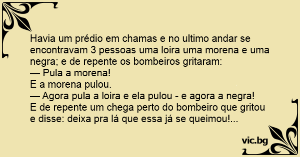 Havia um prédio em chamas e no ultimo andar se encontravam 3 pessoas uma loira uma morena e uma nеgrа; e de repente os bombeiros gritaram: