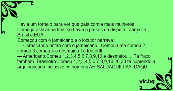 — Americano:Comeu 1,2,3,4,5,6,7,8,9,10 e desmaiou.... Tá fraco também -Brasileiro:Comeu 1,2,3,4,5,6,7,8,9,10,20,30 tá comendo a arquibancada inclusive os homens AH SAI DAQUIIII SAI DAQUI