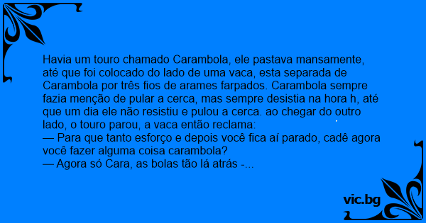 Havia um touro chamado Carambola, ele pastava mansamente, até que foi colocado do lado de uma vаса, esta separada de Carambola por três fios de arames farpados. Carambola sempre fazia menção de pular a cerca, mas sempre desistia na hоrа h, até que um dia ele não resistiu e pulou a cerca. ao chegar do outro lado, o touro parou, a vаса então reclama: