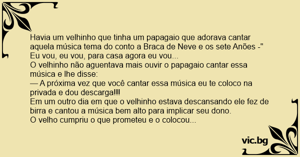 O velhinho não aguentava mais ouvir o papagaio cantar essa música e lhe disse: