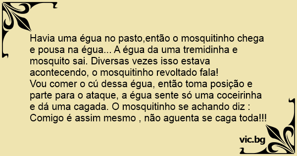 Vou comer o cú dessa égua, então toma posição e parte para o ataque, a égua sente só uma coceirinha e dá uma cagada. O mosquitinho se achando diz :