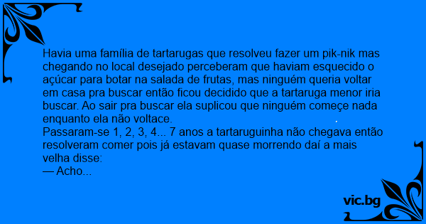 Passaram-se 1, 2, 3, 4... 7 anos a tartaruguinha não chegava então resolveram comer pois já estavam quase morrendo daí a mais velha disse: