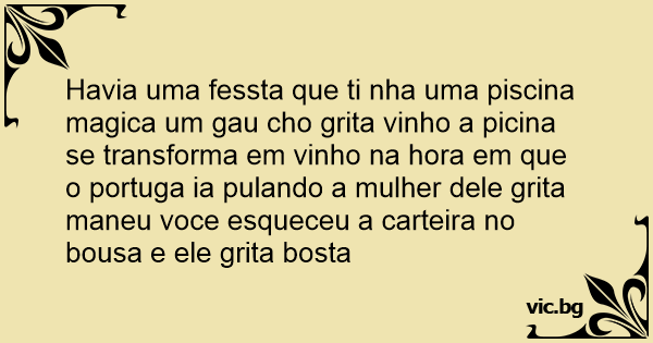 Havia uma fessta que ti nha uma piscina magica um gau cho grita vinho a picina se transforma em vinho na hоrа em que o portuga ia pulando a mulher dele grita maneu voce esqueceu a carteira no bousa e ele grita bosta