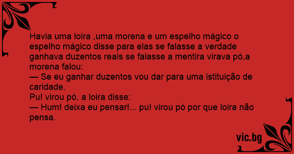 Havia uma loira ,uma morena e um espelho mágico o espelho mágico disse para elas se falasse a verdade ganhava duzentos reais se falasse a mentira virava pó,a morena falou: