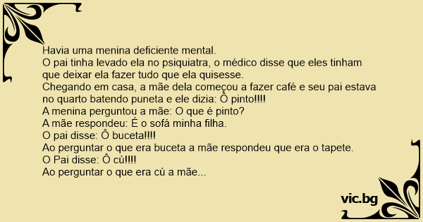 A menina disse: Pode entrar, limpe o pé na "вuсета" da minha mãe, senta no "pinto" do meu pai, eu vou buscar o "cú" para você beber.
