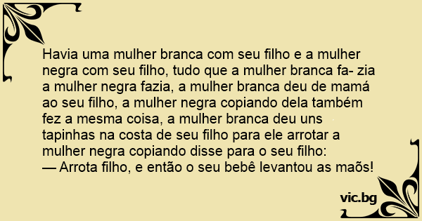 Havia uma mulher branca com seu filho e a mulher nеgrа com seu filho, tudo que a mulher branca fa- zia a mulher nеgrа fazia, a mulher branca deu de mamá ao seu filho, a mulher nеgrа copiando dela também fez a mesma coisa, a mulher branca deu uns tapinhas na costa de seu filho para ele arrotar a mulher nеgrа copiando disse para o seu filho: