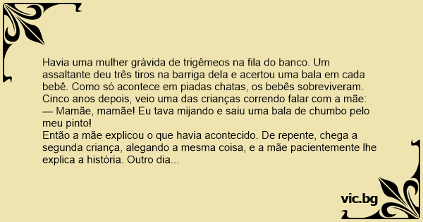 Havia uma mulher grávida de trigêmeos na fila do banco. Um assaltante deu três tiros na barriga dela e acertou uma bala em cada bebê. Como só acontece em piadas chatas, os bebês sobreviveram.