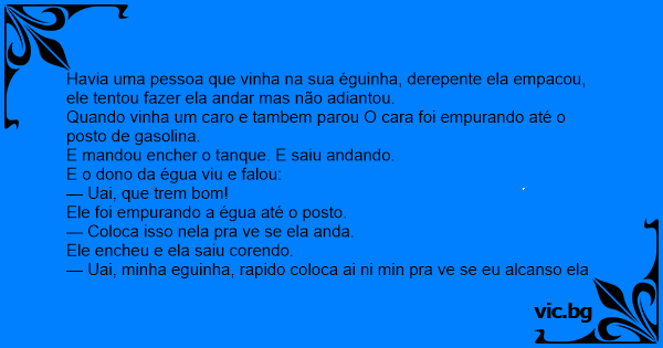 — Uai, minha eguinha, rapido coloca ai ni min pra ve se eu alcanso ela