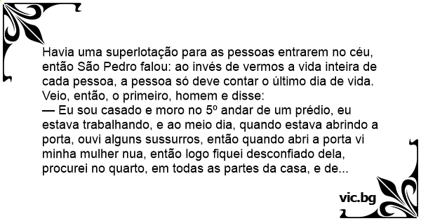 Havia uma superlotação para as pessoas entrarem no céu, então São Pedro falou: ao invés de vermos a vida inteira de cada pessoa, a pessoa só deve contar o último dia de vida.