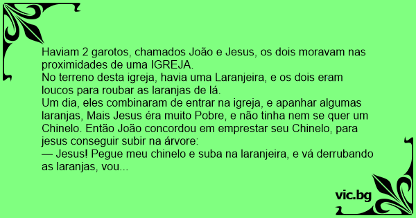 Um dia, eles combinaram de entrar na igreja, e apanhar algumas laranjas, Mais Jesus éra muito Pobre, e não tinha nem se quer um Chinelo. Então João concordou em emprestar seu Chinelo, para jesus conseguir subir na árvore: