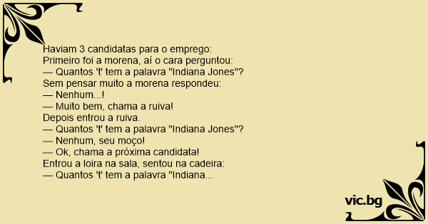 — Quantos 't' tem a palavra "Indiana Jones"?