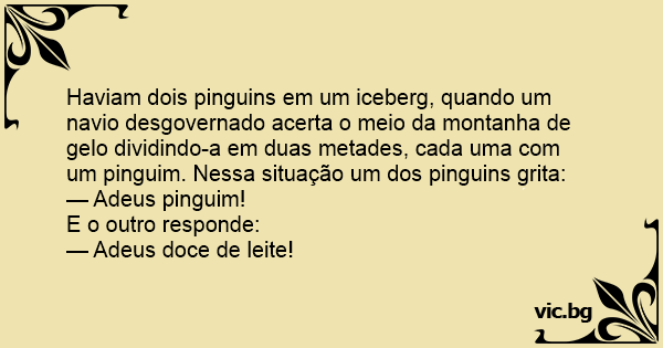 Haviam dois pinguins em um iceberg, quando um navio desgovernado acerta o meio da montanha de gelo dividindo-a em duas metades, cada uma com um pinguim. Nessa situação um dos pinguins grita: