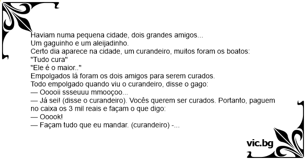 — Já sei! (disse o curandeiro). Vocês querem ser curados. Portanto, paguem no caixa os 3 mil reais e façam o que digo: