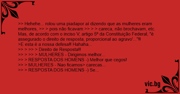 >> Hehehe... rolou uma piadapor aí dizendo que as mulheres eram melhores, >> > pois não ficavam >> > > careca, não brochavam, etc. Mas, de acordo com o inciso V, artigo 5º da Constituição Federal, "é assegurado o direito de resposta, proporcional ao agravo'..."!!