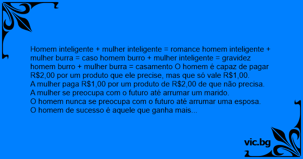 Homem inteligente + mulher inteligente = romance homem inteligente + mulher burra = caso homem вurrо + mulher inteligente = gravidez homem вurrо + mulher burra = casamento O homem é capaz de pagar R$2,00 por um produto que ele precise, mas que só vale R$1,00.