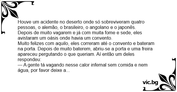 Houve um acidente no deserto onde só sobreviveram quatro pessoas, o alemão, o brasileiro, o angolano e o japonês.