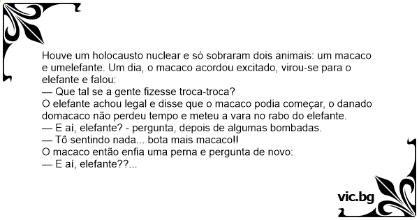 Houve um holocausto nuclear e só sobraram dois animais: um macaco e umelefante. Um dia, o macaco acordou excitado, virou-se para o elefante e falou: