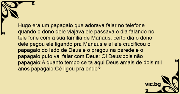 Hugo era um papagaio que adorava falar no telefone quando o dono dele viajava ele passava o dia falando no tele fone com a sua familia de Manaus, certo dia o dono dele pegou ele ligando pra Manaus e aí ele crucificou o papagaio do lado de Deus e o pregou na parede e o papagaio рuто vai falar com Deus: Oi Deus:pois não papagaio:A quanto tempo ce ta aqui Deus amais de dois mil anos papagaio:Cê ligou pra onde?