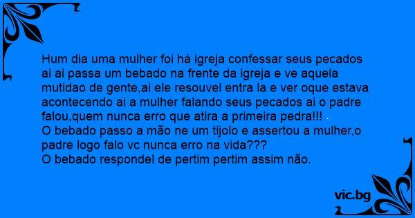 Hum dia uma mulher foi há igreja confessar seus pecados ai ai passa um bebado na frente da igreja e ve aquela mutidao de gente,ai ele resouvel entra la e ver oque estava acontecendo ai a mulher falando seus pecados ai o padre falou,quem nunca erro que atira a primeira pedra!!!