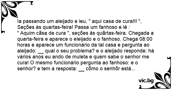 Ia passando um aleijado e leu, " aqui casa de cura!!! ", Seções às quartas-feira! Passa um fanhoso e lê :