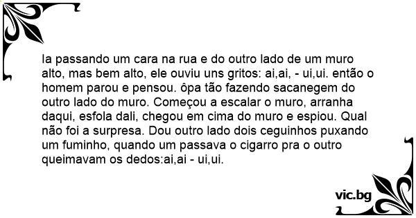 Ia passando um cara na rua e do outro lado de um muro alto, mas bem alto, ele ouviu uns gritos: ai,ai, - ui,ui. então o homem parou e pensou. ôpa tão fazendo sacanegem do outro lado do muro. Começou a escalar o muro, arranha daqui, esfola dali, chegou em cima do muro e espiou. Qual não foi a surpresa. Dou outro lado dois ceguinhos puxando um fuminho, quando um passava o cigarro pra o outro queimavam os dedos:ai,ai - ui,ui.