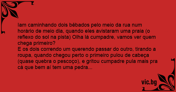 Iam caminhando dois bêbados pelo meio da rua num horário de meio dia, quando eles avistaram uma praia (o reflexo do sol na pista) Olha lá cumpadre, vamos ver quem chega primeiro?